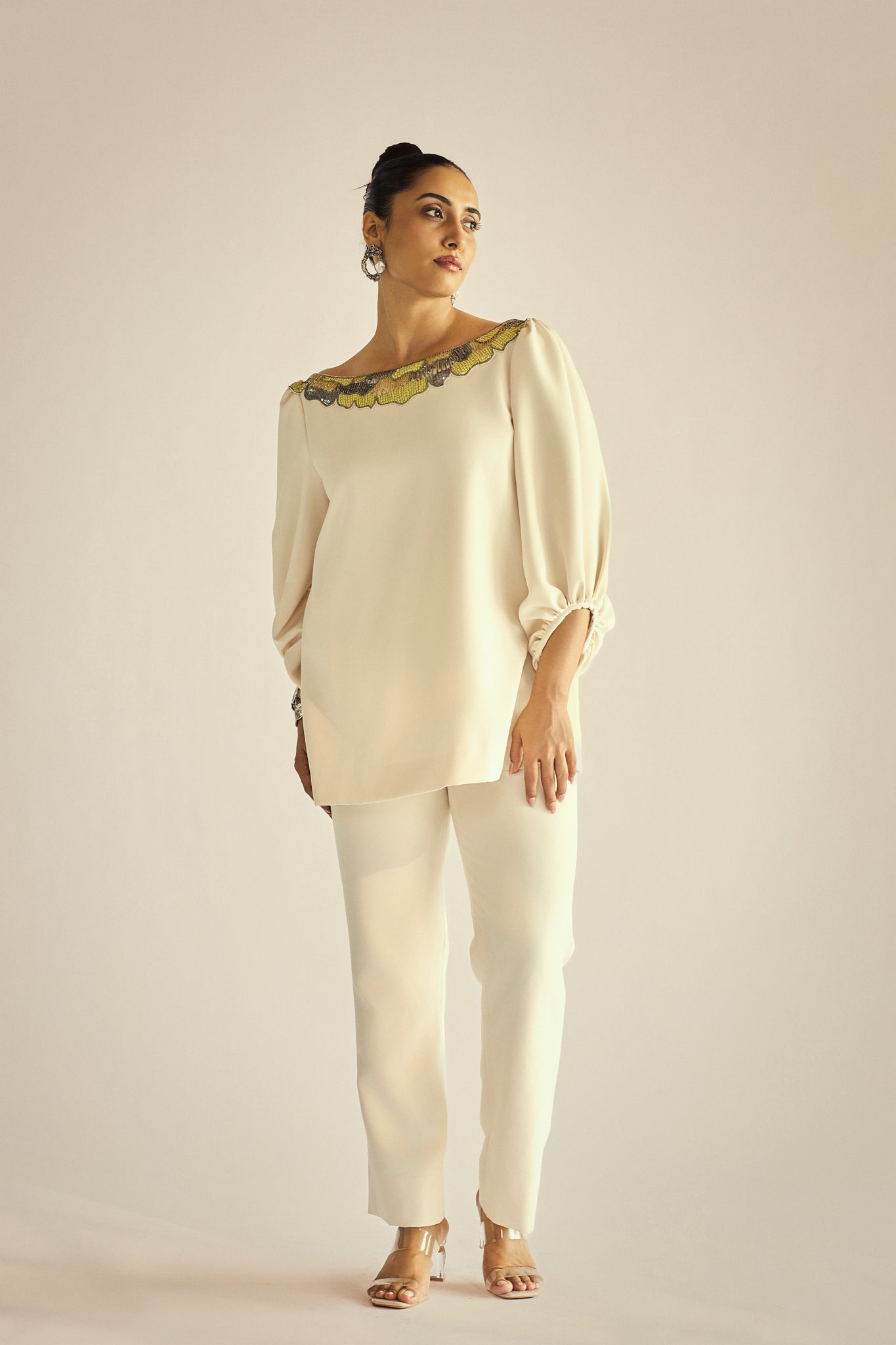 This is how you do effortless glamour! The Aura Co-ord Set gives you instant sunshine with its beautiful Ivory fabric. The relaxed co-ord features fun puffy sleeves and a beautifully embellished, scalloped neckline ! Paired with the sleek matching pants, this set is comfortable, luxurious, and totally elevates your style game.