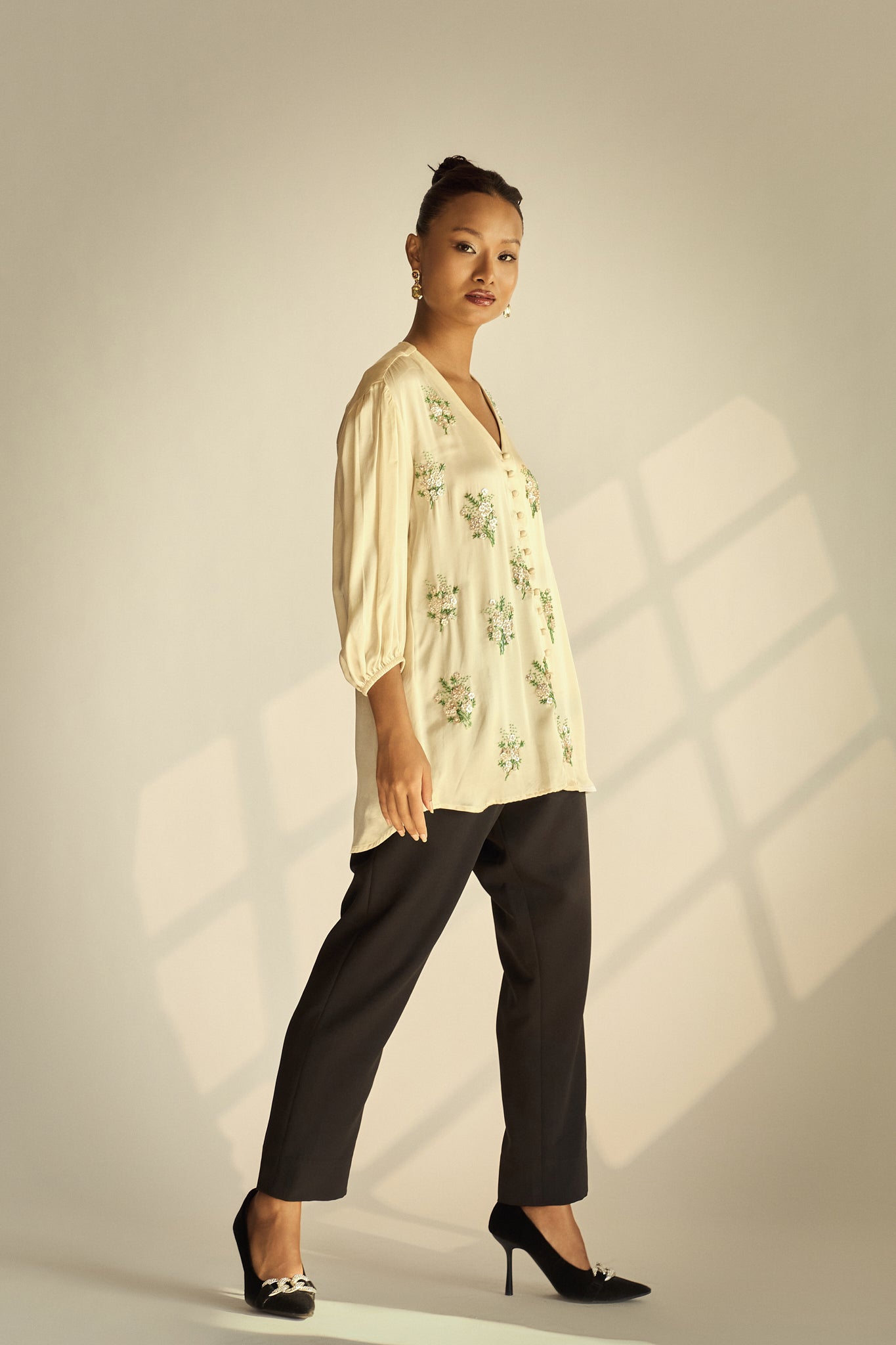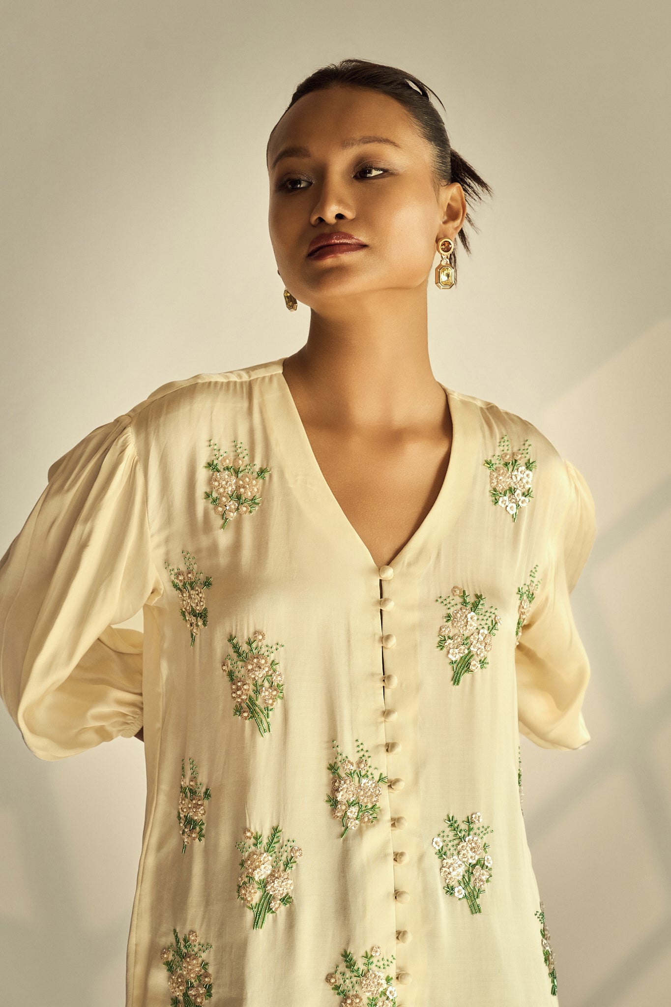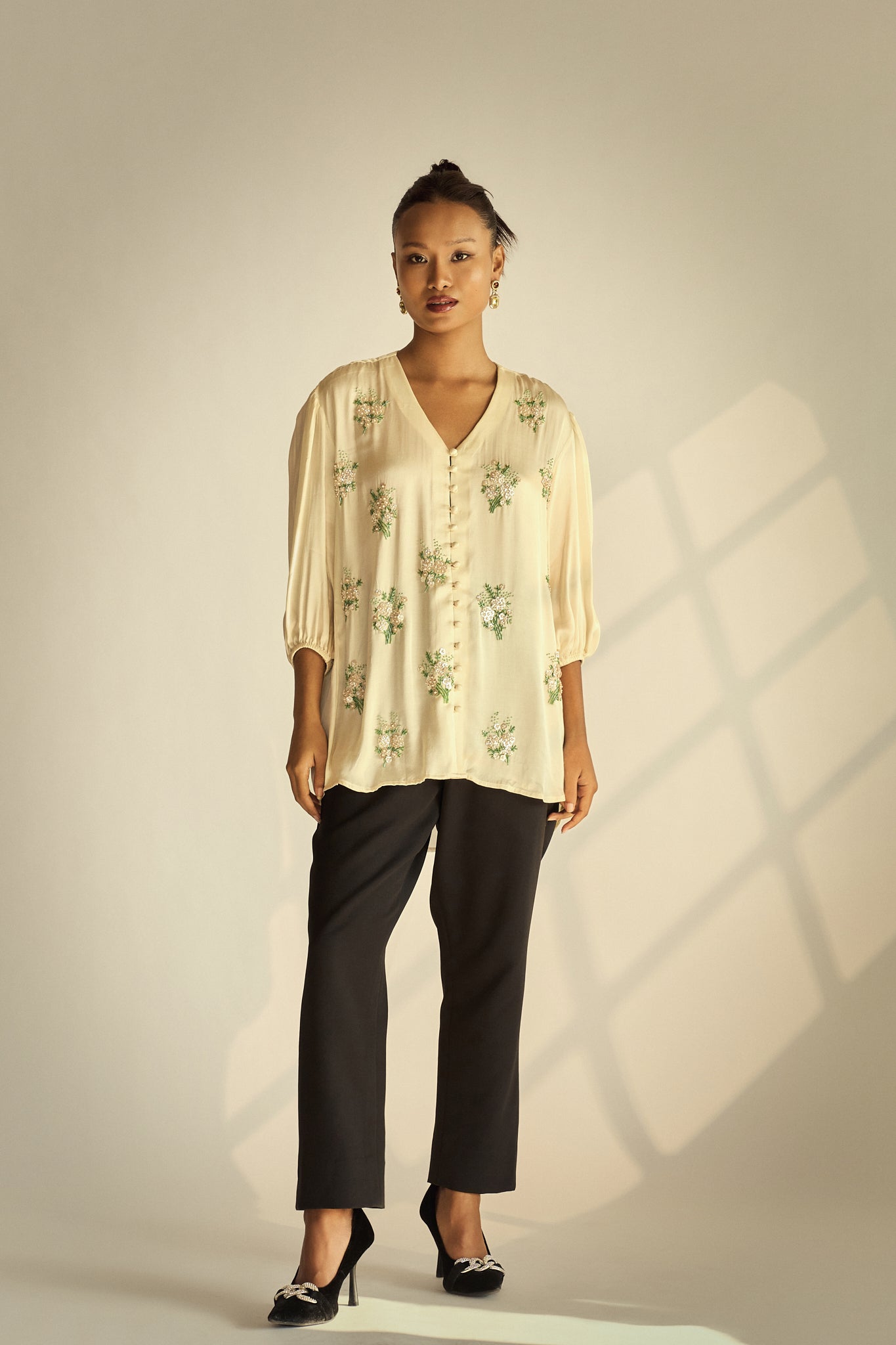 A softly structured shirt top elevated with scattered hand-embellished florals for a subtle touch of sparkle. The fluid drape, relaxed fit, and covered buttons create an easy silhouette that feels polished yet effortlessly modern.