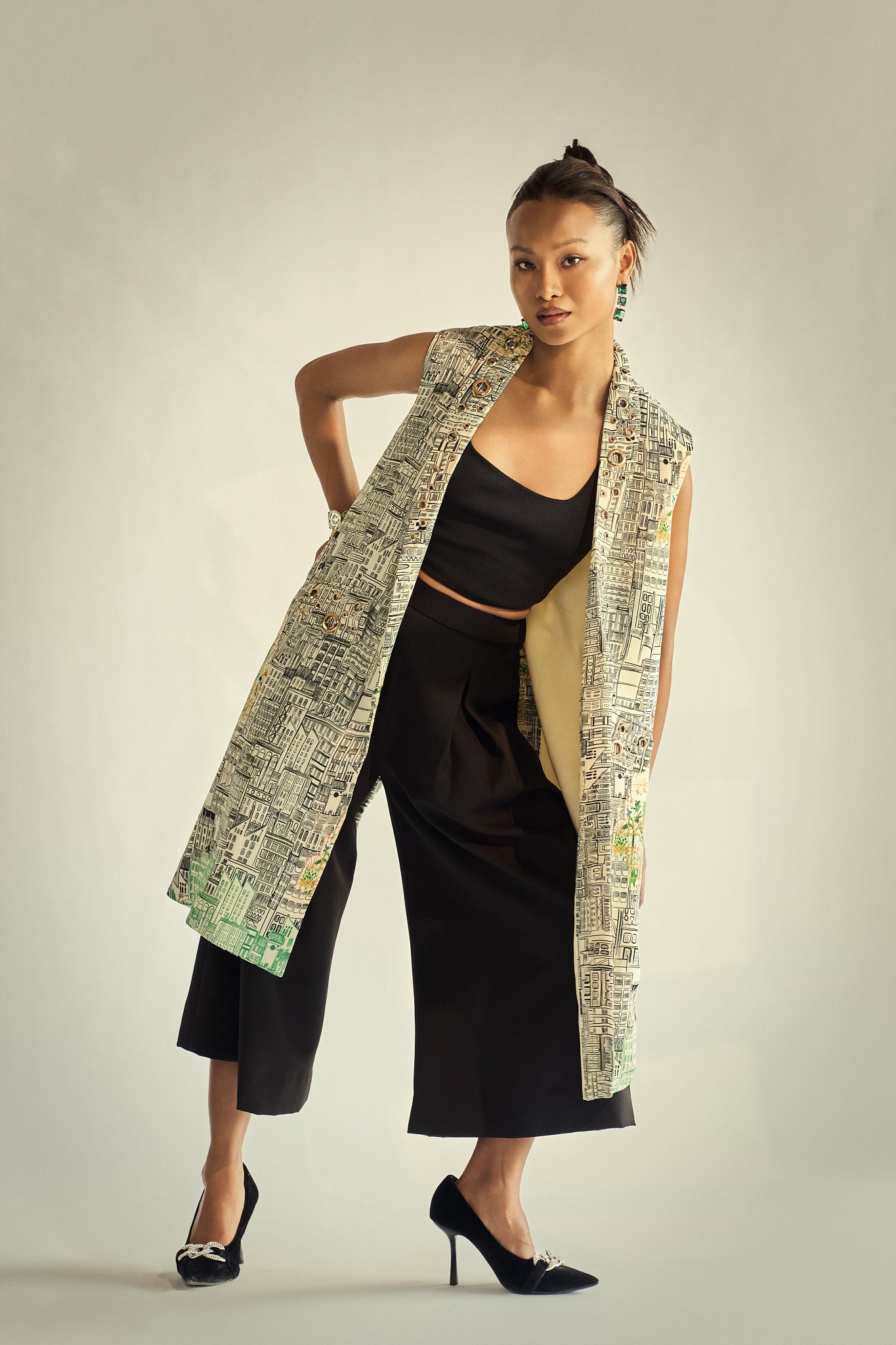 Hello, statement piece! This fabulous long, sleeveless jacket features a mesmerizing cityscape print that turns heads. Look closely—the pockets are punctuated with playful gold rivet details, adding a flash of edgy glamour. It's the perfect instant upgrade for any simple outfit.