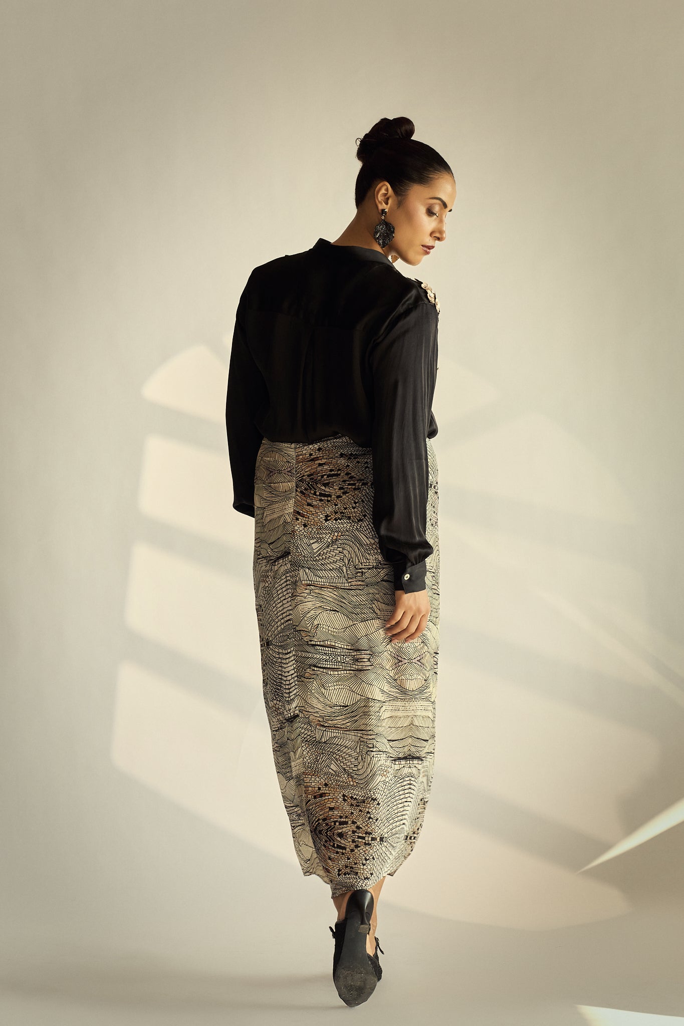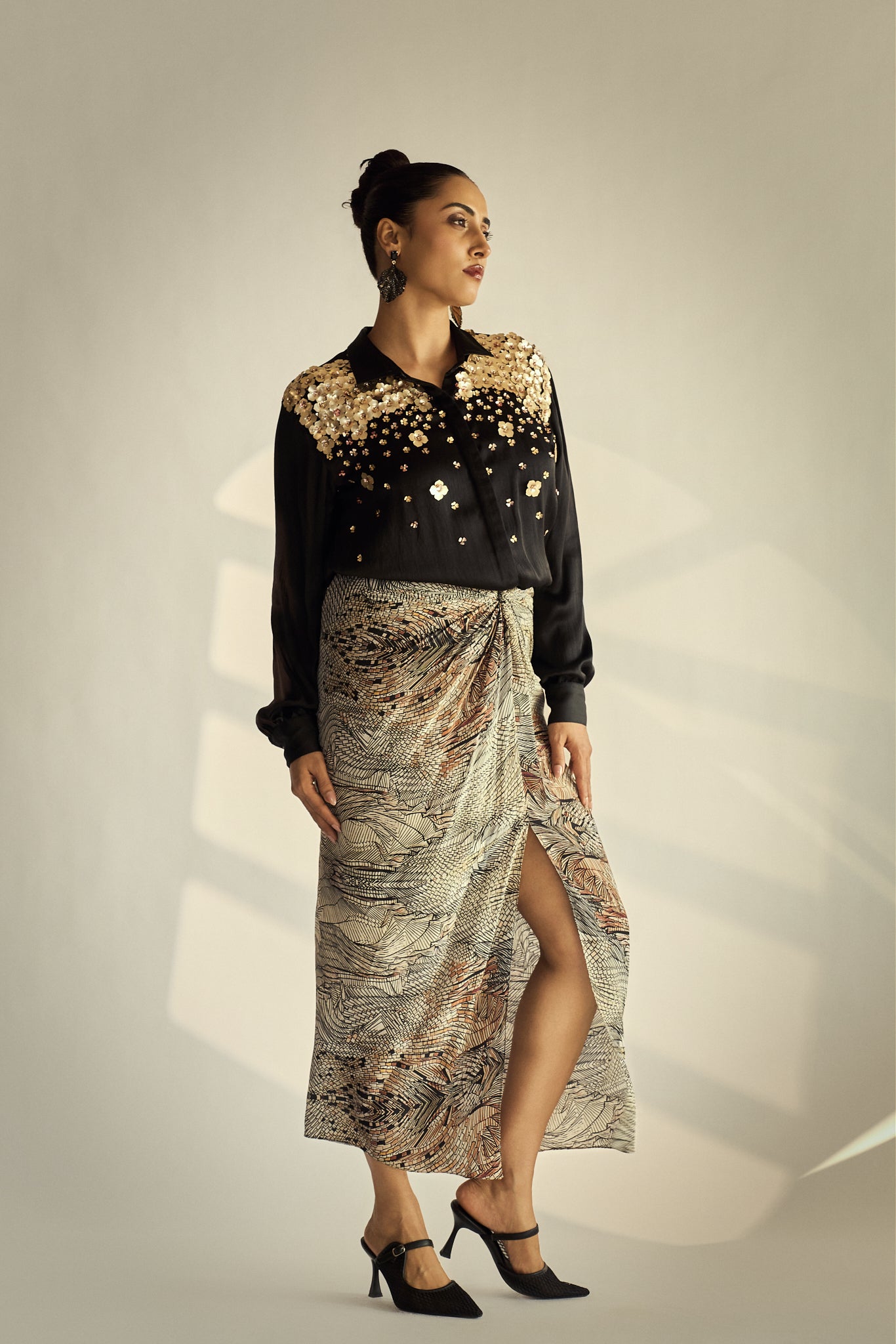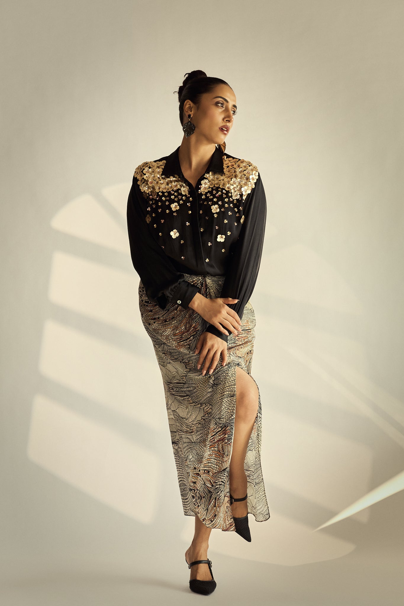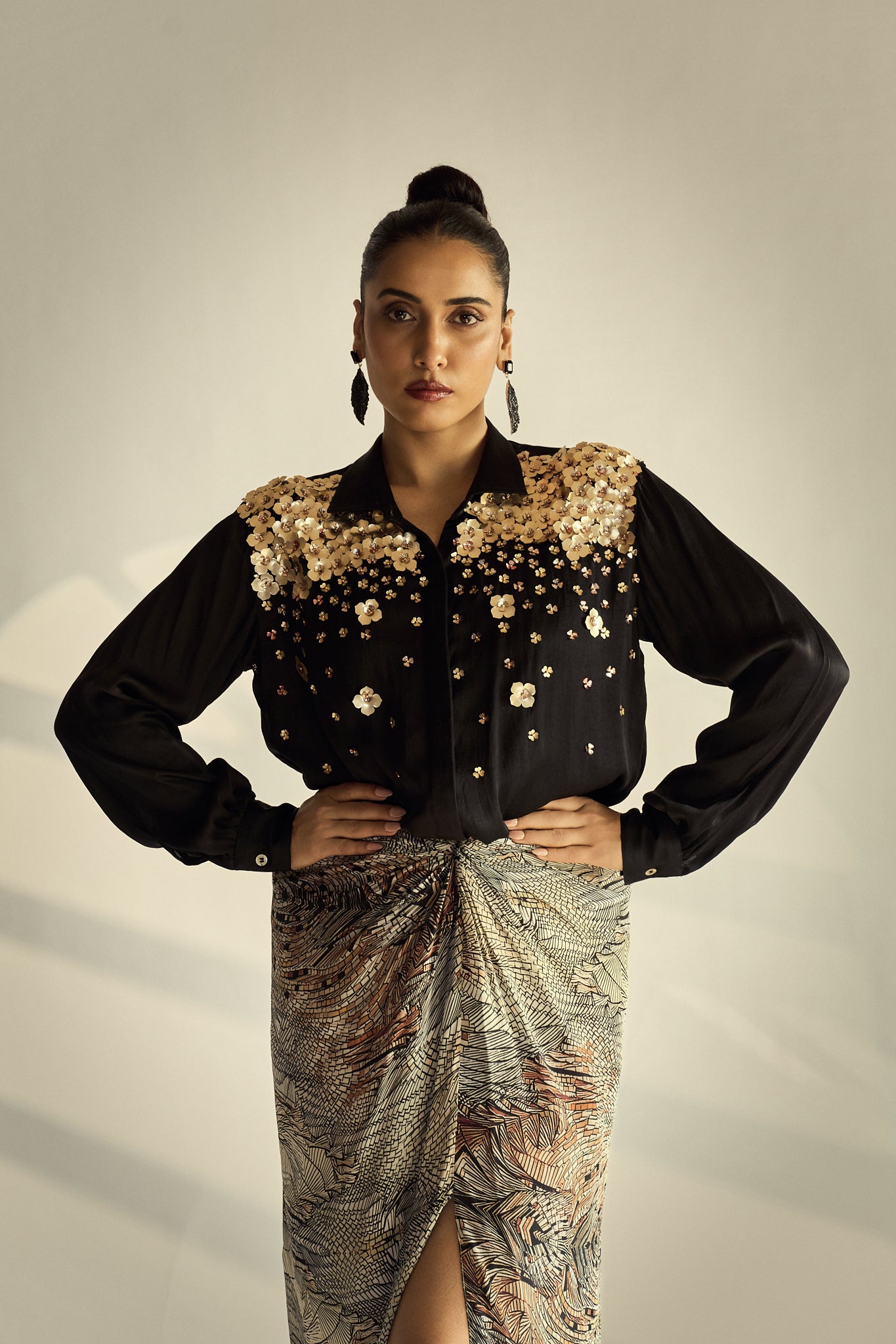 A statement shirt crafted in fluid silk satin fabric, adorned with dense to light hand-embellished florals across the yoke for a striking play of texture and shine. Balanced by a clean silhouette and classic collar, it brings bold elegance to evening-ready separates.
