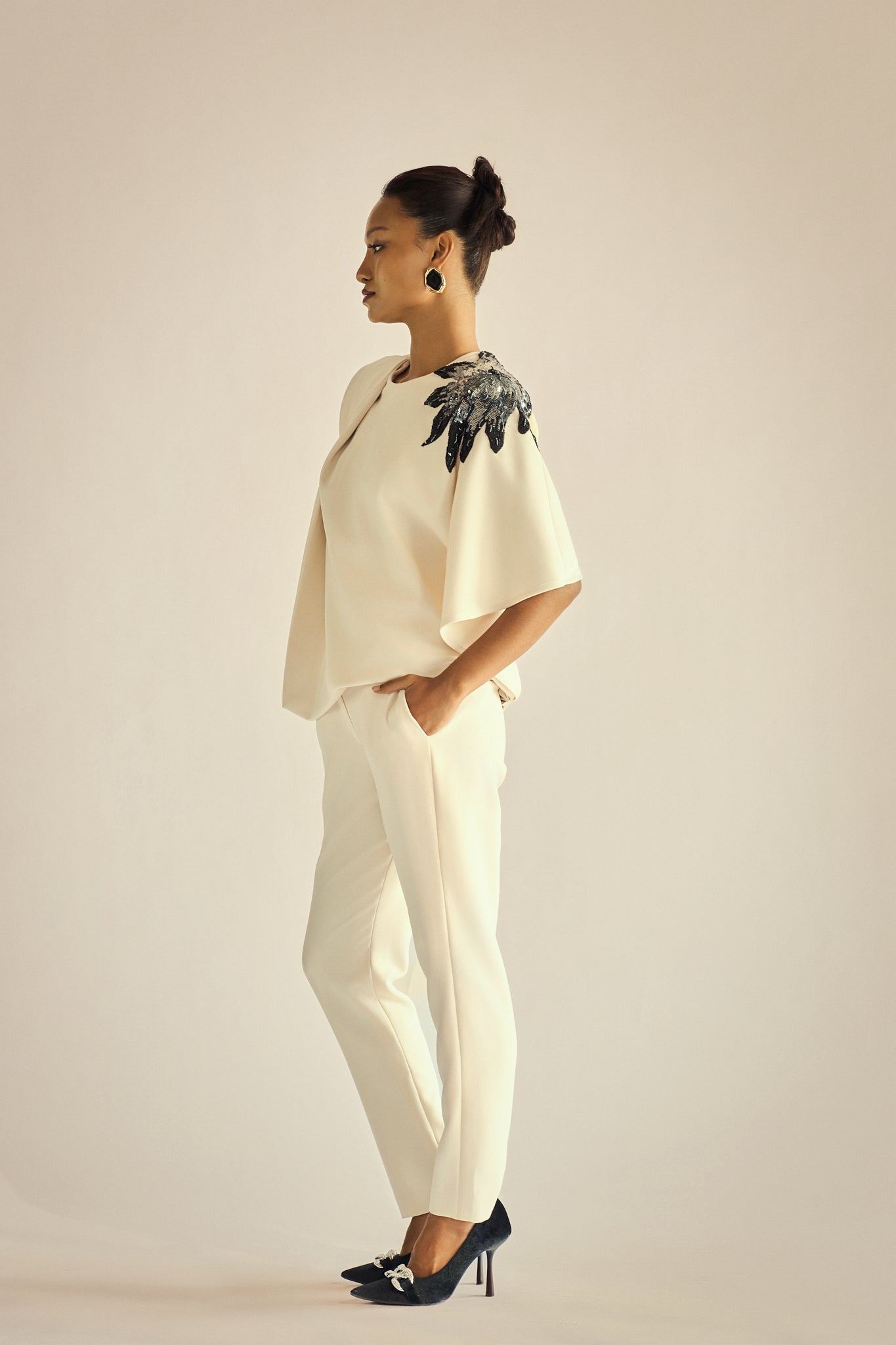 A sharp, modern ensemble featuring an ivory top. The top is defined by its architectural, draped shoulder detail and a striking black sequin and bead floral appliqué on the shoulder, offering a sophisticated, polished look.
