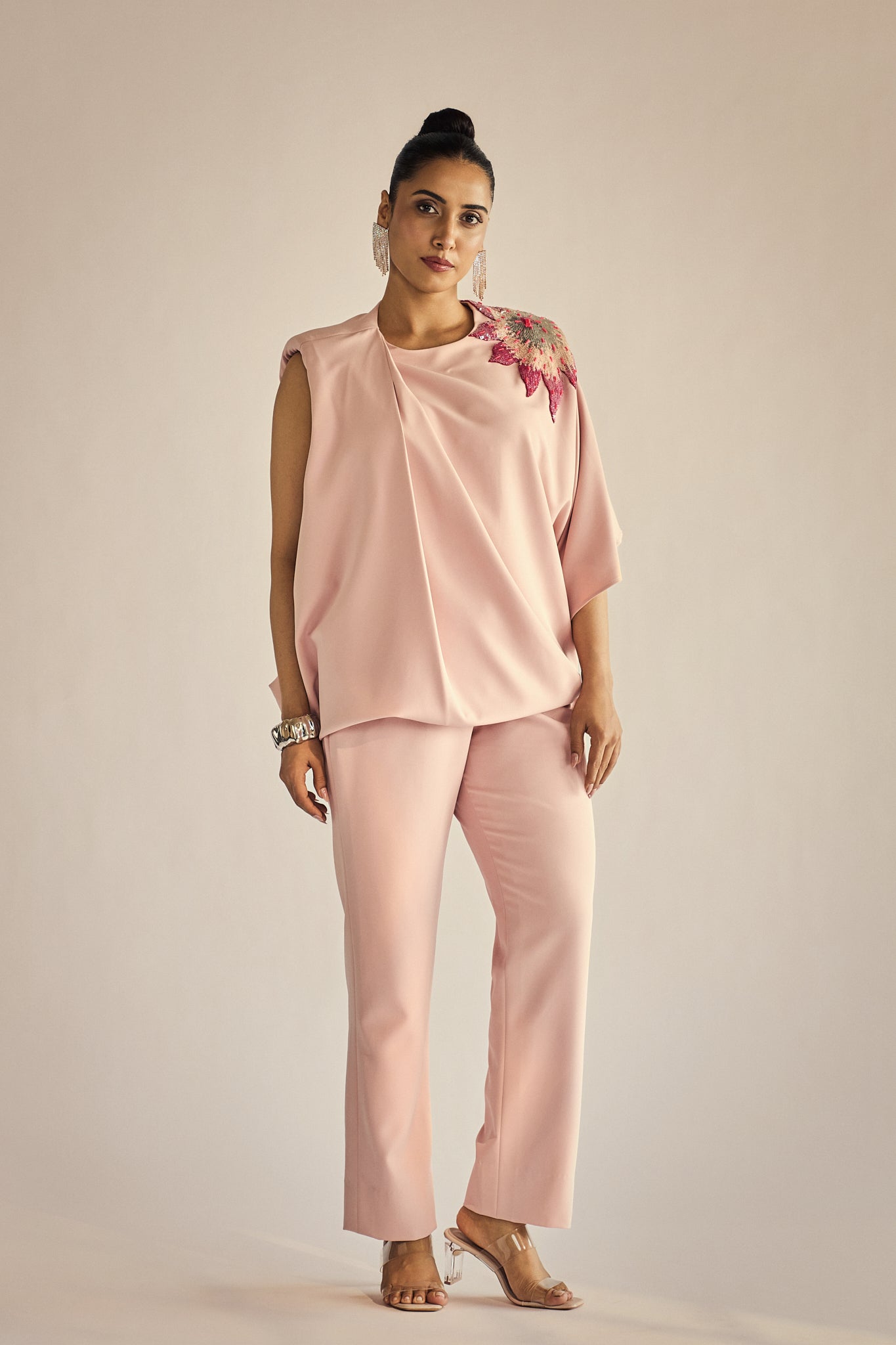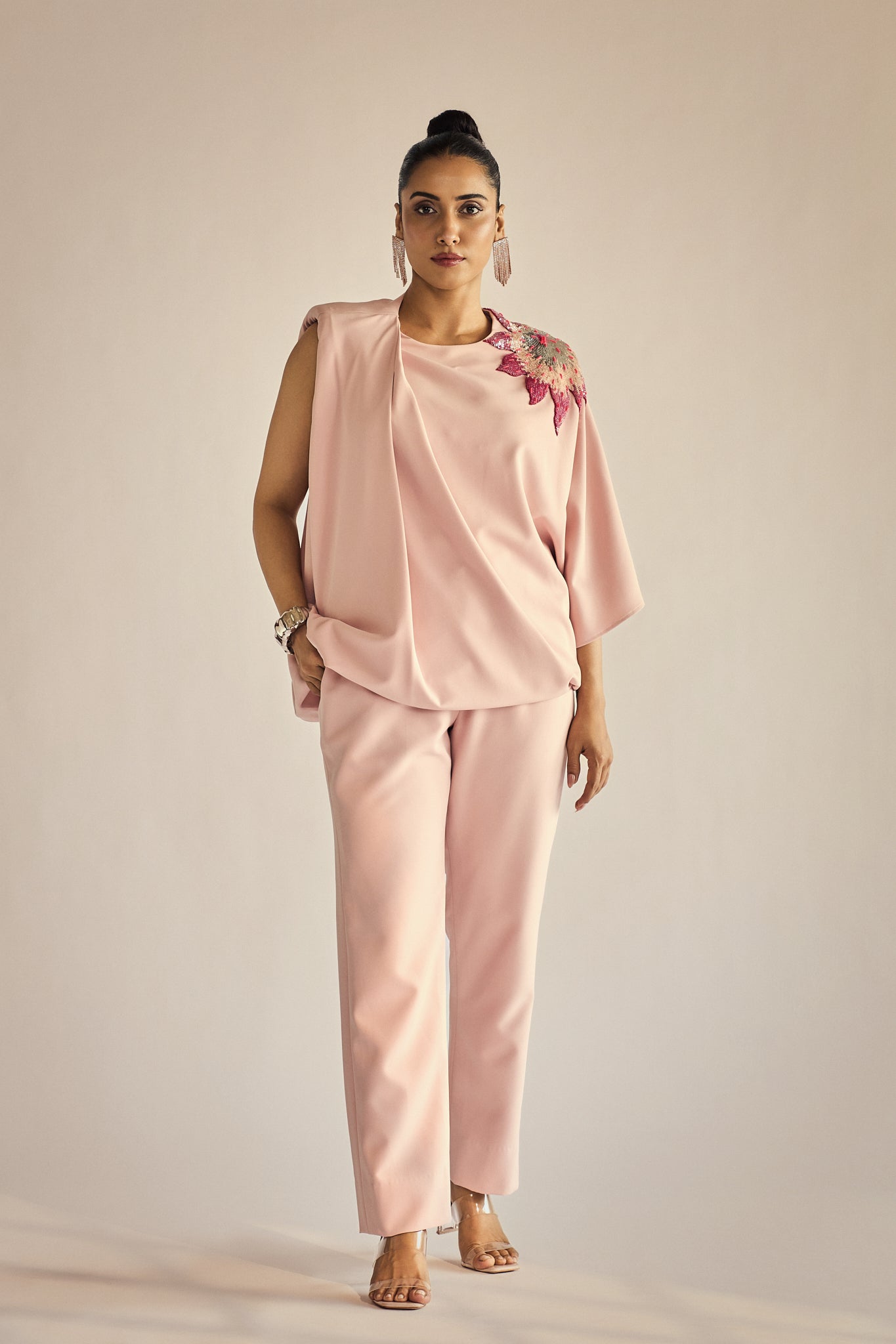 A sharp, modern two-piece ensemble featuring an blush pink tunic top and tailored slim-fit trousers. The top is defined by its architectural, draped shoulder detail and a striking black sequin and bead floral appliqué on the shoulder, offering a sophisticated, polished look.