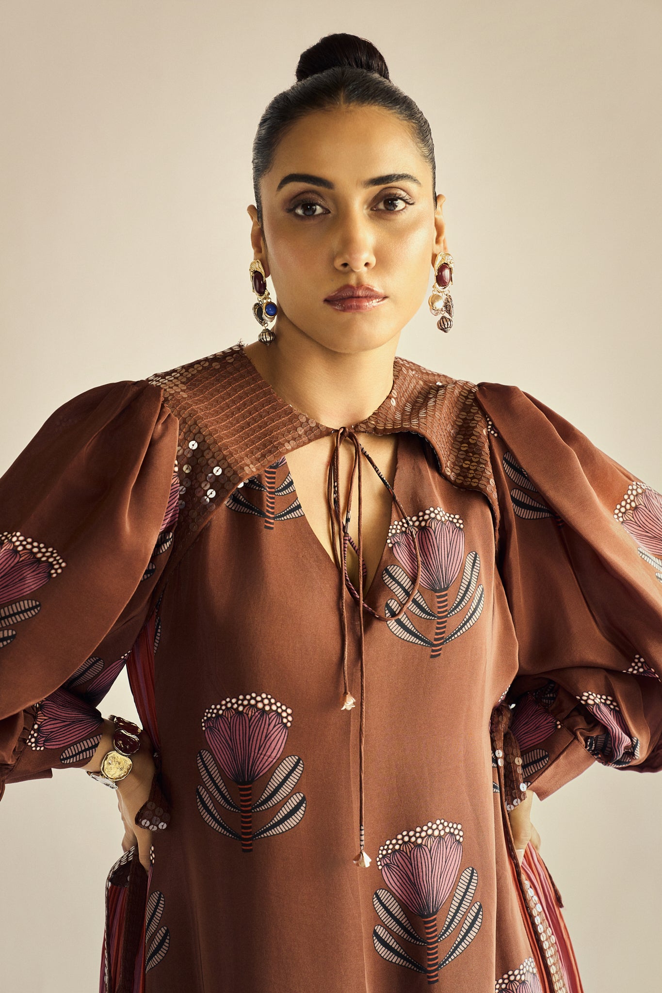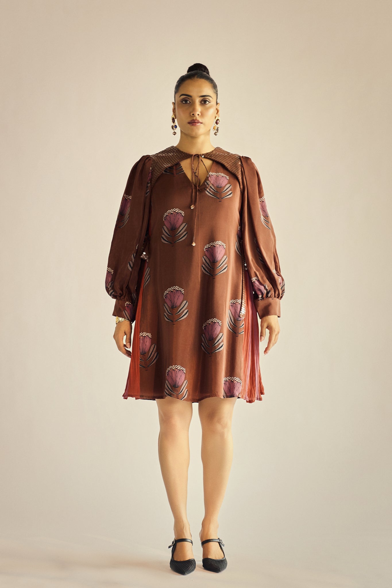 Wear it year-round in our Truffle Tie-Up Dress! Mocha petal print meets sparkly sequin accents, with playfully gathered sides and an adjustable tie-up detail. A season-spanning essential that's equal parts fun and fabulous.